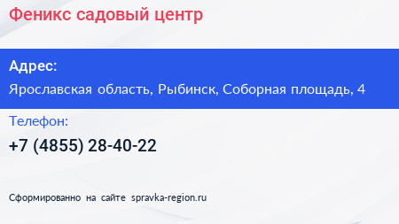 Феникс, садовый центр по адресу Ярославская область, Рыбинск, Соборная площадь, 4 в дальнейшем Организация, размещена в следующих категориях:
