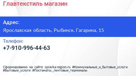 Главтекстиль, магазин по адресу Ярославская область, Рыбинск, Гагарина, 15 в дальнейшем Организация, размещена в следующих категориях: