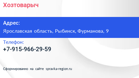 Хозтоварыч по адресу Ярославская область, Рыбинск, Фурманова, 9 в дальнейшем Организация, размещена в следующих категориях: