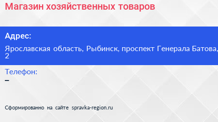 Магазин хозяйственных товаров по адресу Ярославская область, Рыбинск, проспект Генерала Батова, 2 в дальнейшем Организация, размещена в следующих категориях: