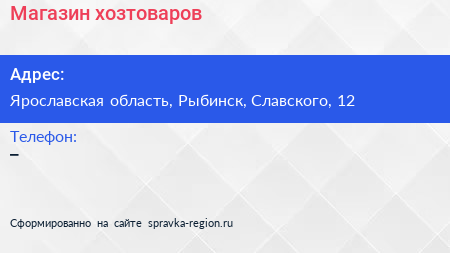 Магазин хозтоваров по адресу Ярославская область, Рыбинск, Славского, 12 в дальнейшем Организация, размещена в следующих категориях: