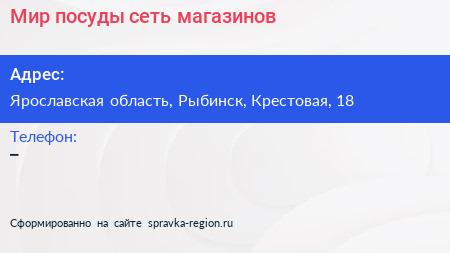 Мир посуды, сеть магазинов по адресу Ярославская область, Рыбинск, Крестовая, 18 в дальнейшем Организация, размещена в следующих категориях: