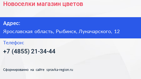 Новоселки, магазин цветов по адресу Ярославская область, Рыбинск, Луначарского, 12 в дальнейшем Организация, размещена в следующих категориях: