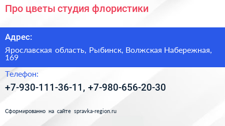 Про цветы, студия флористики по адресу Ярославская область, Рыбинск, Волжская Набережная, 169 в дальнейшем Организация, размещена в следующих категориях: