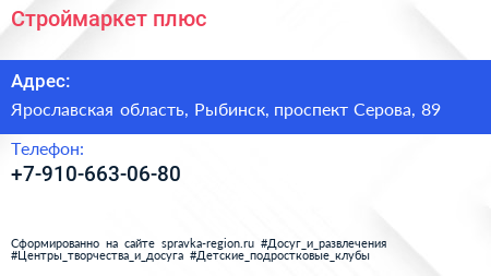 Строймаркет плюс по адресу Ярославская область, Рыбинск, проспект Серова, 89 в дальнейшем Организация, размещена в следующих категориях: