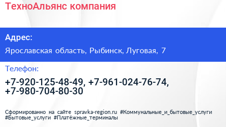 ТехноАльянс, компания по адресу Ярославская область, Рыбинск, Луговая, 7 в дальнейшем Организация, размещена в следующих категориях: