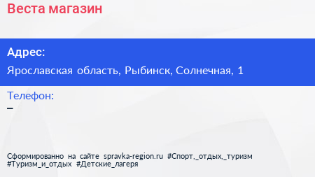Веста, магазин по адресу Ярославская область, Рыбинск, Солнечная, 1 в дальнейшем Организация, размещена в следующих категориях: