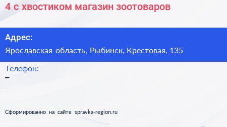 4 с хвостиком, магазин зоотоваров по адресу Ярославская область, Рыбинск, Крестовая, 135 в дальнейшем Организация, размещена в следующих категориях:
