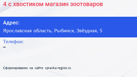 4 с хвостиком, магазин зоотоваров по адресу Ярославская область, Рыбинск, Звёздная, 5 в дальнейшем Организация, размещена в следующих категориях: