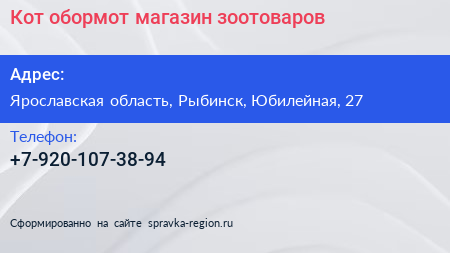 Кот обормот, магазин зоотоваров по адресу Ярославская область, Рыбинск, Юбилейная, 27 в дальнейшем Организация, размещена в следующих категориях: