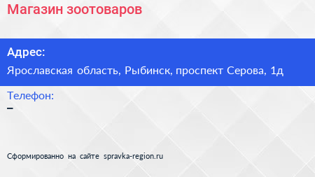 Магазин зоотоваров по адресу Ярославская область, Рыбинск, проспект Серова, 1д в дальнейшем Организация, размещена в следующих категориях: