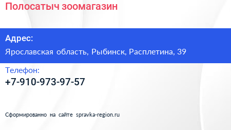 Полосатыч, зоомагазин по адресу Ярославская область, Рыбинск, Расплетина, 39 в дальнейшем Организация, размещена в следующих категориях:
