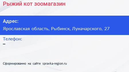 Рыжий кот, зоомагазин по адресу Ярославская область, Рыбинск, Луначарского, 27 в дальнейшем Организация, размещена в следующих категориях: