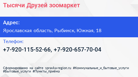 Тысячи Друзей, зоомаркет по адресу Ярославская область, Рыбинск, Южная, 18 в дальнейшем Организация, размещена в следующих категориях: