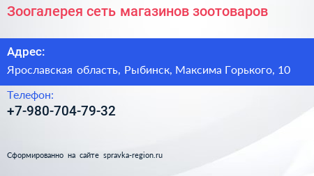 Зоогалерея, сеть магазинов зоотоваров по адресу Ярославская область, Рыбинск, Максима Горького, 10 в дальнейшем Организация, размещена в следующих категориях: