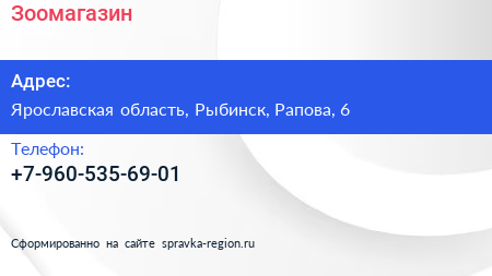 Зоомагазин по адресу Ярославская область, Рыбинск, Рапова, 6 в дальнейшем Организация, размещена в следующих категориях: