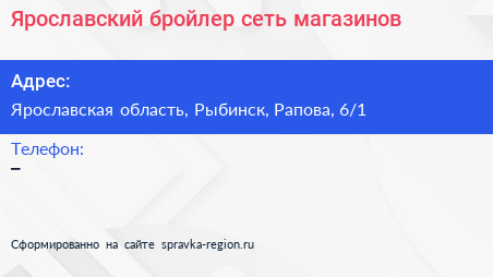 Ярославский бройлер, сеть магазинов по адресу Ярославская область, Рыбинск, Рапова, 6/1 в дальнейшем Организация, размещена в следующих категориях: