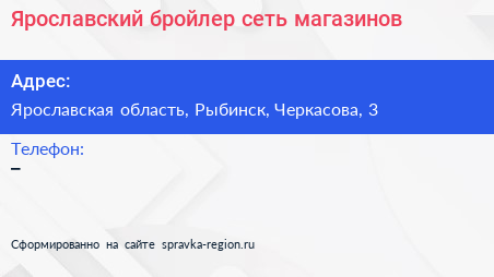 Ярославский бройлер, сеть магазинов по адресу Ярославская область, Рыбинск, Черкасова, 3 в дальнейшем Организация, размещена в следующих категориях: