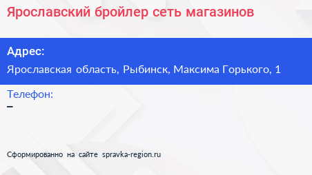 Ярославский бройлер, сеть магазинов по адресу Ярославская область, Рыбинск, Максима Горького, 1 в дальнейшем Организация, размещена в следующих категориях: