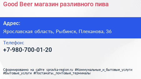 Good Beer, магазин разливного пива по адресу Ярославская область, Рыбинск, Плеханова, 36 в дальнейшем Организация, размещена в следующих категориях: