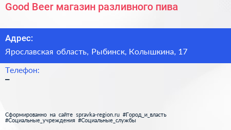 Good Beer, магазин разливного пива по адресу Ярославская область, Рыбинск, Колышкина, 17 в дальнейшем Организация, размещена в следующих категориях: