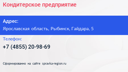 Кондитерское предприятие по адресу Ярославская область, Рыбинск, Гайдара, 5 в дальнейшем Организация, размещена в следующих категориях: