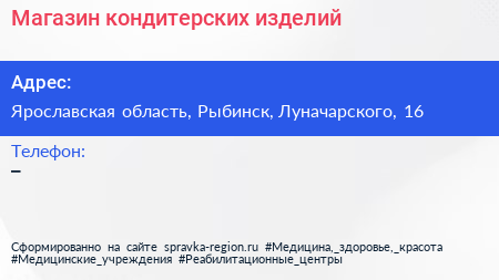 Магазин кондитерских изделий по адресу Ярославская область, Рыбинск, Луначарского, 16 в дальнейшем Организация, размещена в следующих категориях: