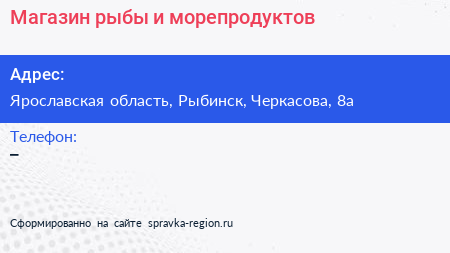 Магазин рыбы и морепродуктов по адресу Ярославская область, Рыбинск, Черкасова, 8а в дальнейшем Организация, размещена в следующих категориях: