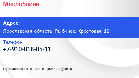Маслобойня по адресу Ярославская область, Рыбинск, Крестовая, 12 в дальнейшем Организация, размещена в следующих категориях: