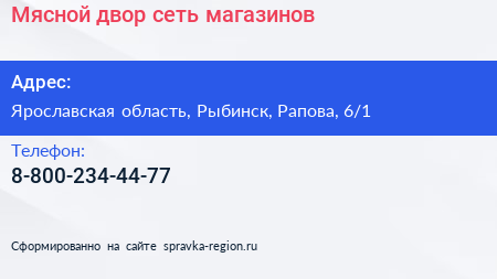 Мясной двор, сеть магазинов по адресу Ярославская область, Рыбинск, Рапова, 6/1 в дальнейшем Организация, размещена в следующих категориях: