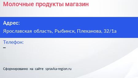 Молочные продукты, магазин по адресу Ярославская область, Рыбинск, Плеханова, 32/1а в дальнейшем Организация, размещена в следующих категориях: