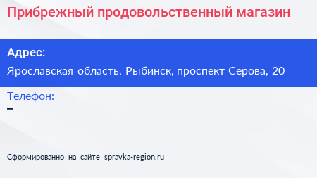 Прибрежный, продовольственный магазин по адресу Ярославская область, Рыбинск, проспект Серова, 20 в дальнейшем Организация, размещена в следующих категориях: