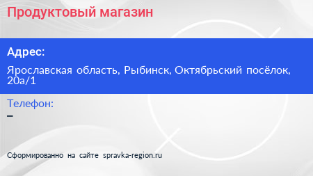 Продуктовый магазин по адресу Ярославская область, Рыбинск, Октябрьский посёлок, 20а/1 в дальнейшем Организация, размещена в следующих категориях: