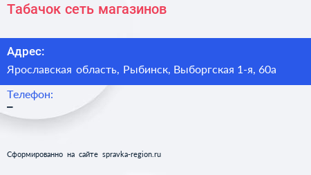 Табачок, сеть магазинов по адресу Ярославская область, Рыбинск, Выборгская 1-я, 60а в дальнейшем Организация, размещена в следующих категориях: