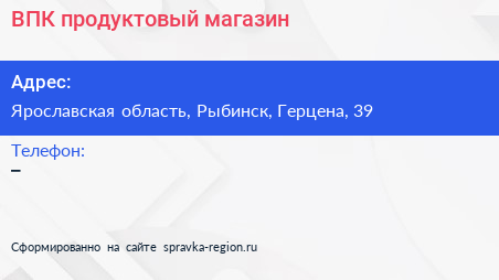 ВПК, продуктовый магазин по адресу Ярославская область, Рыбинск, Герцена, 39 в дальнейшем Организация, размещена в следующих категориях: