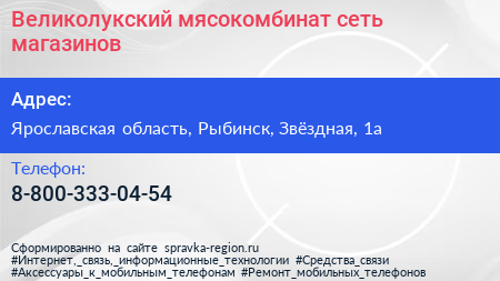 Великолукский мясокомбинат, сеть магазинов по адресу Ярославская область, Рыбинск, Звёздная, 1а в дальнейшем Организация, размещена в следующих категориях: