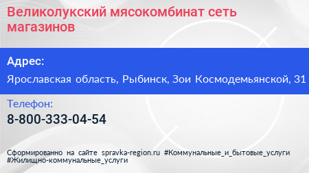 Великолукский мясокомбинат, сеть магазинов по адресу Ярославская область, Рыбинск, Зои Космодемьянской, 31 в дальнейшем Организация, размещена в следующих категориях: