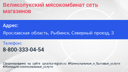Великолукский мясокомбинат, сеть магазинов по адресу Ярославская область, Рыбинск, Северный проезд, 3 в дальнейшем Организация, размещена в следующих категориях: