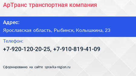 АрТранс, транспортная компания по адресу Ярославская область, Рыбинск, Колышкина, 23 в дальнейшем Организация, размещена в следующих категориях: