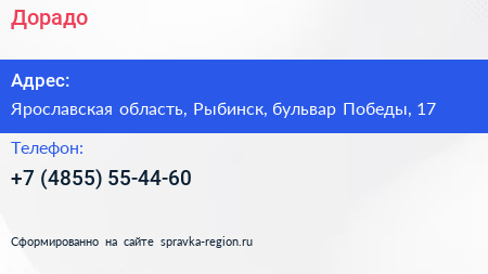 Дорадо по адресу Ярославская область, Рыбинск, бульвар Победы, 17 в дальнейшем Организация, размещена в следующих категориях: