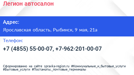Легион, автосалон по адресу Ярославская область, Рыбинск, 9 мая, 21а в дальнейшем Организация, размещена в следующих категориях: