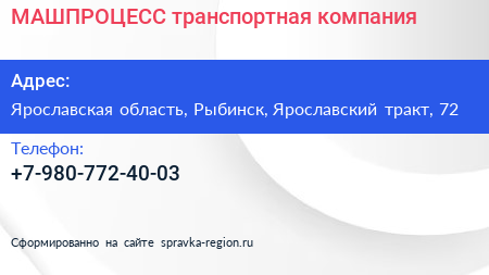 МАШПРОЦЕСС, транспортная компания по адресу Ярославская область, Рыбинск, Ярославский тракт, 72 в дальнейшем Организация, размещена в следующих категориях: