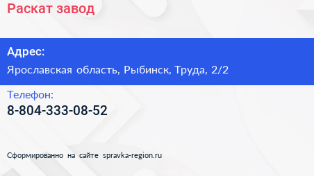 Раскат, завод по адресу Ярославская область, Рыбинск, Труда, 2/2 в дальнейшем Организация, размещена в следующих категориях: