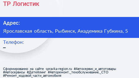 ТР-Логистик по адресу Ярославская область, Рыбинск, Академика Губкина, 5 в дальнейшем Организация, размещена в следующих категориях: