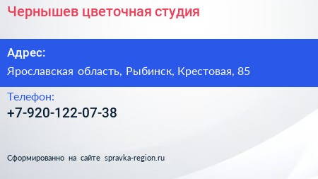 Чернышев, цветочная студия по адресу Ярославская область, Рыбинск, Крестовая, 85 в дальнейшем Организация, размещена в следующих категориях: