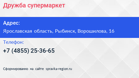 Дружба, супермаркет по адресу Ярославская область, Рыбинск, Ворошилова, 16 в дальнейшем Организация, размещена в следующих категориях:
