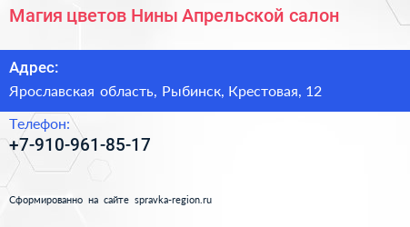 Магия цветов Нины Апрельской, салон по адресу Ярославская область, Рыбинск, Крестовая, 12 в дальнейшем Организация, размещена в следующих категориях: