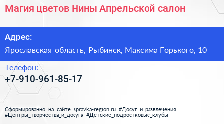 Магия цветов Нины Апрельской, салон по адресу Ярославская область, Рыбинск, Максима Горького, 10 в дальнейшем Организация, размещена в следующих категориях: