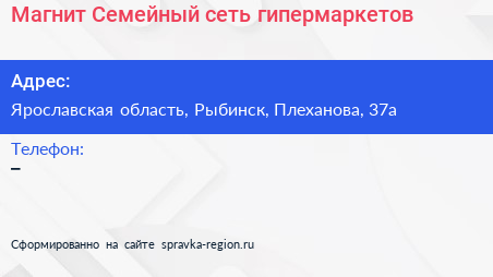 Магнит Семейный, сеть гипермаркетов по адресу Ярославская область, Рыбинск, Плеханова, 37а в дальнейшем Организация, размещена в следующих категориях: