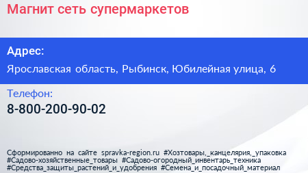 Магнит, сеть супермаркетов по адресу Ярославская область, Рыбинск, Юбилейная улица, 6 в дальнейшем Организация, размещена в следующих категориях: